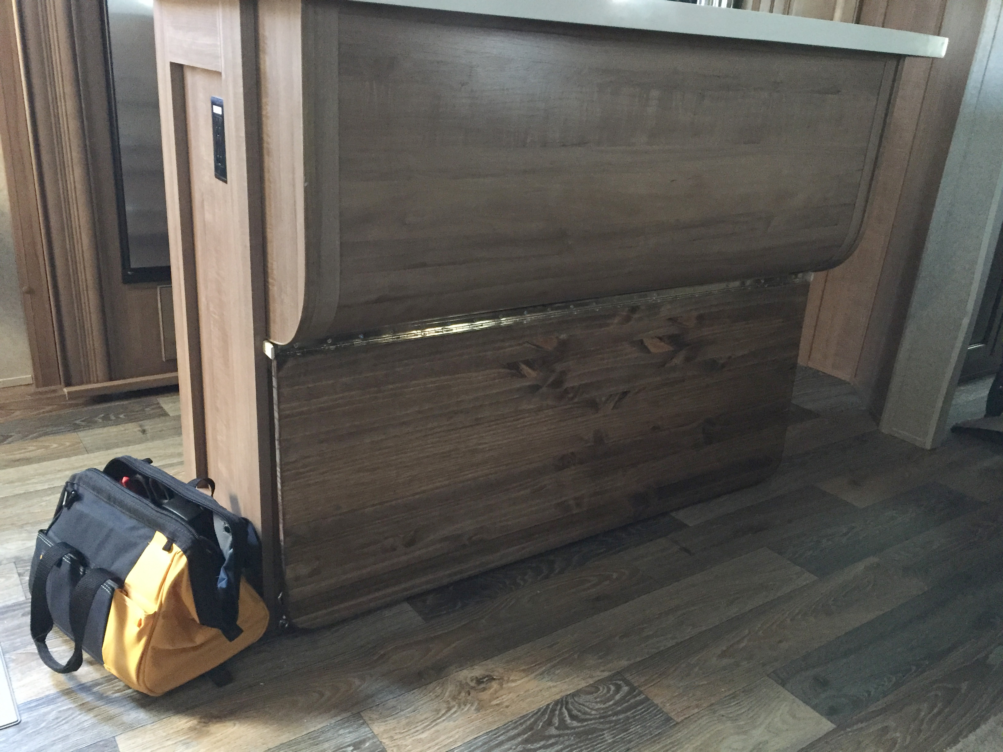 I stained all the wood with a walnut stain to approximate the trailer decor. Then added two coats of Polyeurothane and finished up the top with some 2000 grit wet paper on the table top and then fine steel wool. The 1 X 2 strip was screwed in just under the overhang.