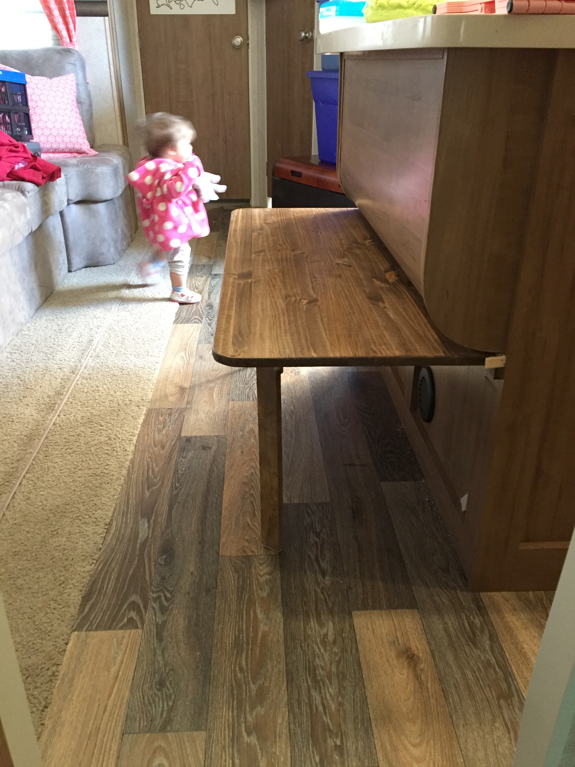 One of my thoughts in building this was these girls are very inquisitive and active. I didn’t want them to see this table as something they could put up/down on their own, pinching fingers along the way – so operation needed to be somewhat childproof. The final part was to add a small wood block to the cabinet and install a screw eye into the that block and the under side of the table top so they overlap. A strong clip could then be used to lock the table in the closed position. The girls each have one of those folding step stools to sit on (they get stored in the island cabinet). All four girls will easily fit there (one each end, two in the middle) and they are over the vinyl floor cause spills WILL happen. While the table needs to be put down for the slide to clear, it can be left up all they time the slide is out and there is plenty of room to walk through. It doubles as a project, coloring or whatever place for the girls to enjoy.